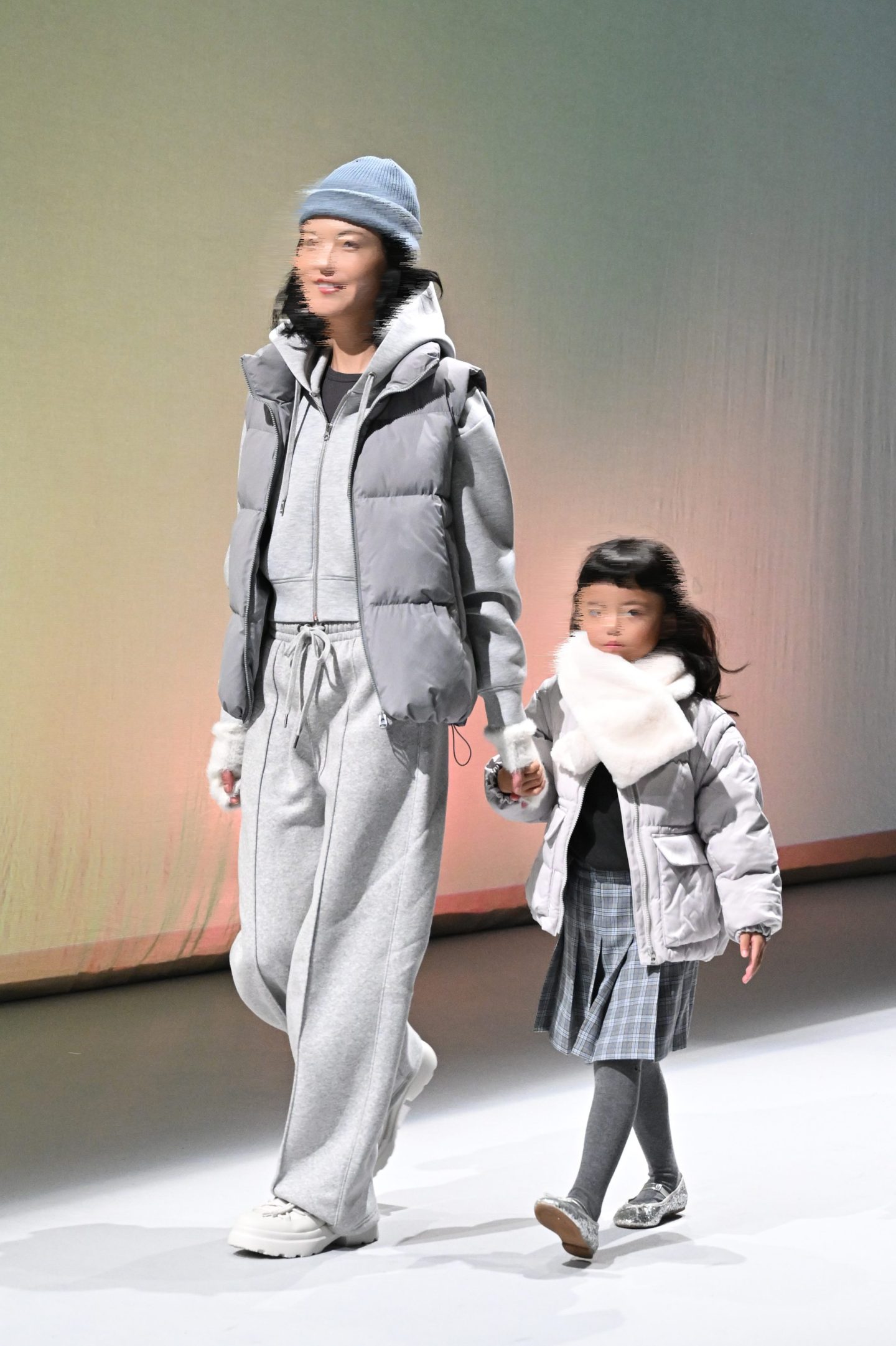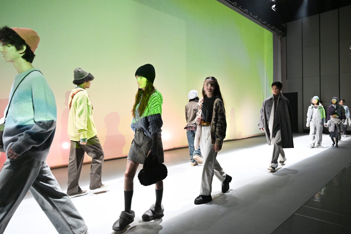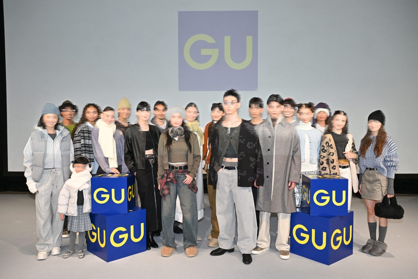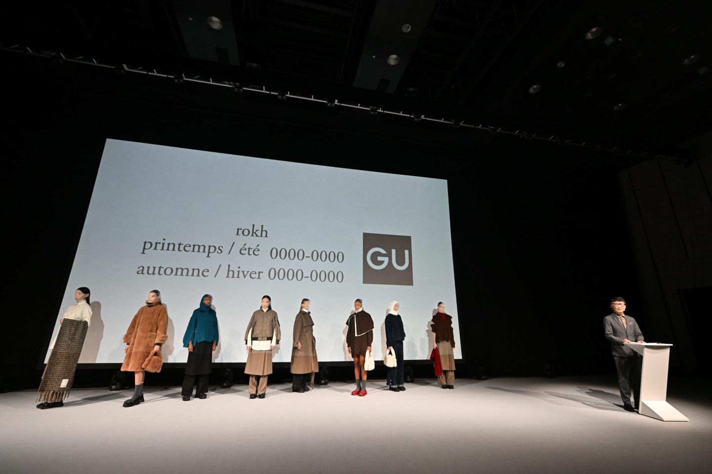 GU 2024年事業方針説明会 Tokyo, JapanPress conference柚木治代表取締役社長が登壇し、今後の事業家核を語る説明会に加え、新作をランウェイショー形式で披露するイベント。ヒカリエホールの天高を生かした白幕と照明効果でシーズナルテーマを表現しました。