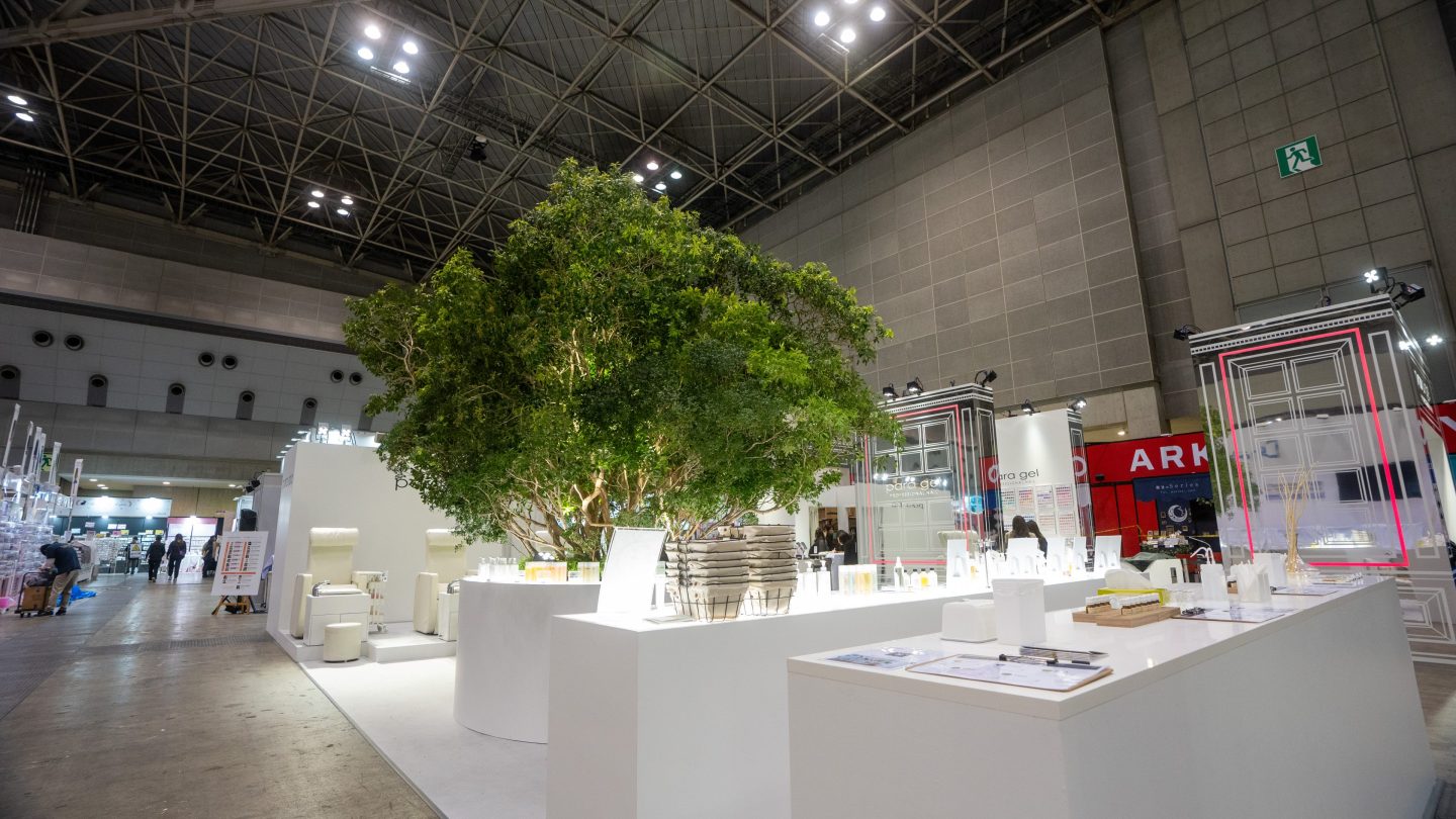 展示会では珍しいミラーアクリルや、生のグリーンを配置し、会場のランドマークとなりました。